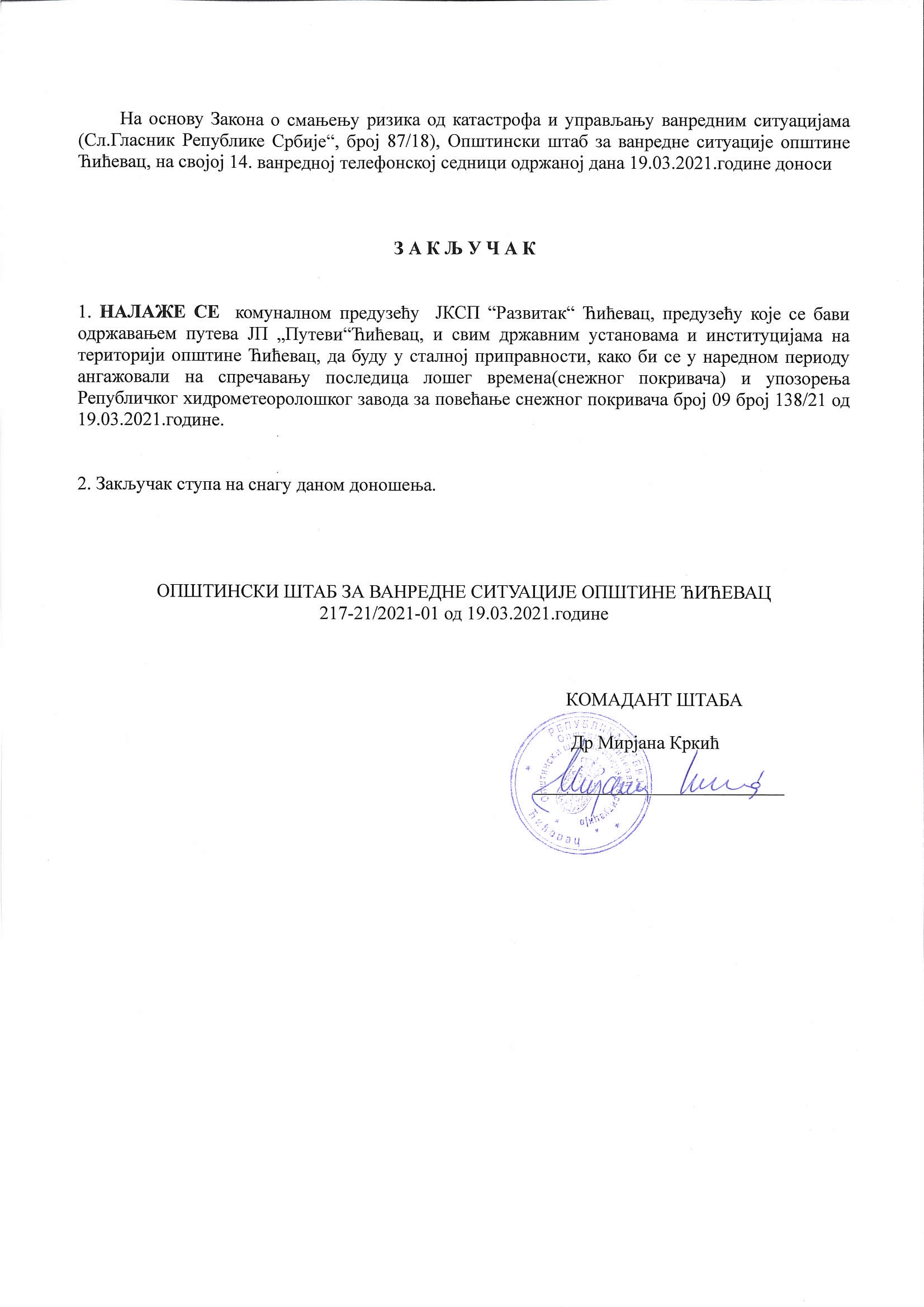 14.седница Штаба за ванредне ситуације општине Ћићевац